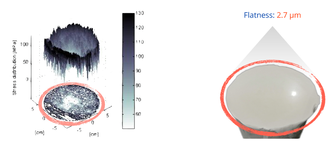Độ phẳng có thể đạt tới mức thấp tới 2,7 μm. (xem hình 2) Bề mặt nhẵn hoàn toàn đến từ bùn thạch cao chảy và tấm kính dày. Sau khi phủ kính, bề mặt thạch cao sẽ phẳng giống như kính tương tự như gương.