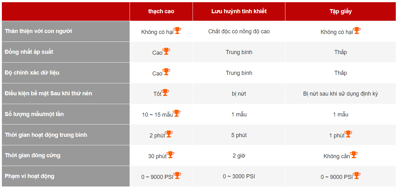 Như dữ liệu cho thấy, lớp phủ thạch cao có thể tạo ra điều kiện bề mặt lớp phủ tốt nhất với độ phẳng hoàn toàn, vuông góc và theo chiều ngang. Khi nó có thể đạt giá trị cường độ nén cao nhất và người ta sẽ có thể thu được dữ liệu ổn định và ổn định bất cứ lúc nào . Từ quan điểm vận hành, Thạch cao chỉ cần nước để phản ứng. Nó cung cấp một môi trường thân thiện với con người và cũng làm tăng hiệu quả của việc chuẩn bị mẫu.