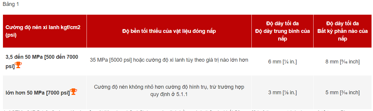 3. ASTM c617 5.1: Độ bền của vật liệu làm nắp và độ dày của nắp phải phù hợp với yêu cầu ở Bảng 1.